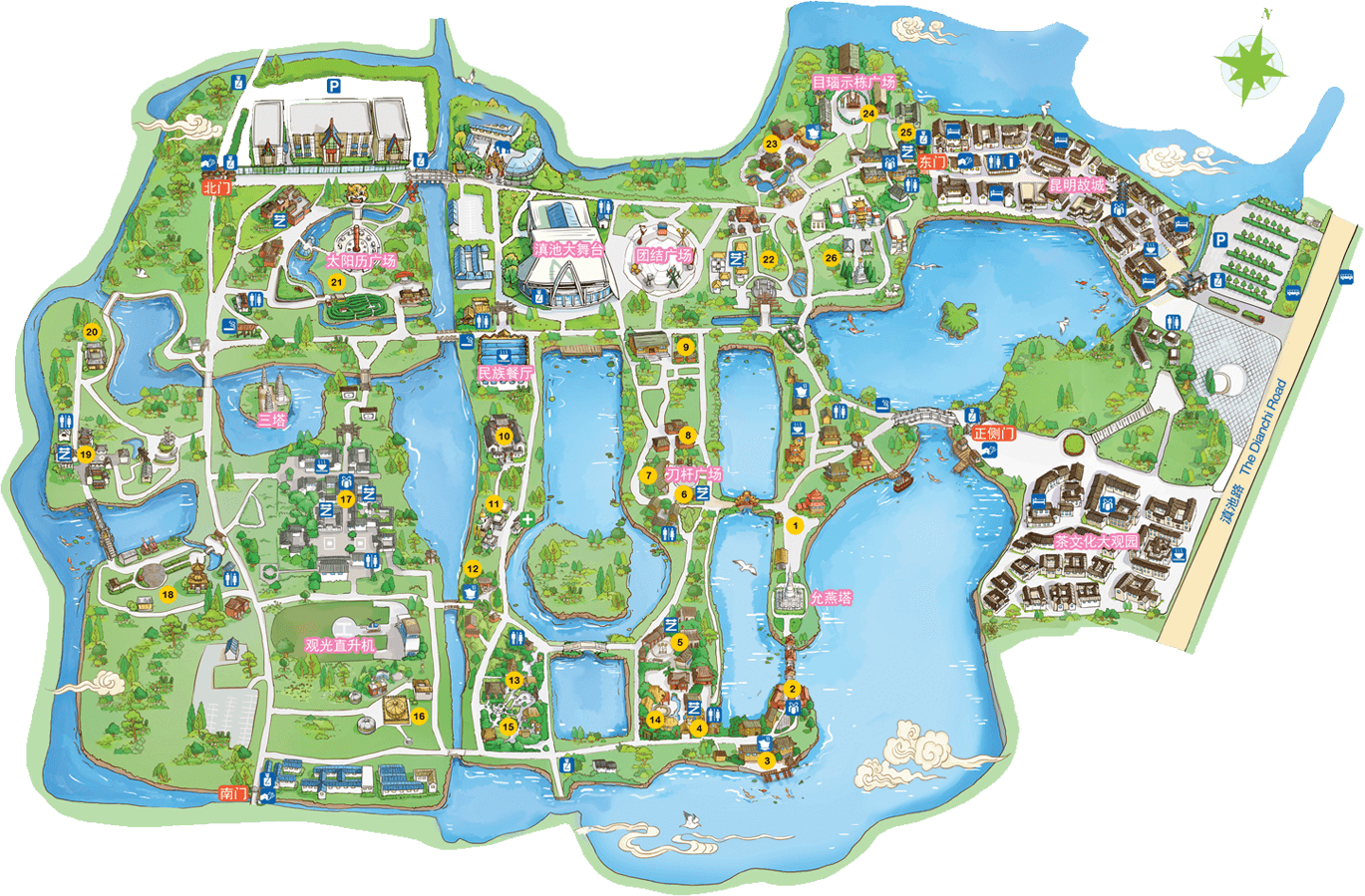 佤族人口約36萬,主要聚居在云南省瀾滄江南段以西的阿佤山區。佤族寨位于“翠漪洲”東南角。寨內分布有茅草頂的干欄式建筑群、牛頭廣場、神靈廣場、司崗里石雕以及糧倉等。牛頭廣場是佤族古老的剽?;顒訄鏊瑘稣械呐=菫樨糇宓恼瘶?,廣場前的兩個石人分別為佤族的男性和女性祖先。神靈廣場表現了佤族萬物有靈、靈魂不死的自然崇拜觀念。場中兩個石人雕像分別為佤族最崇拜的“木依吉”和“阿依娥”。佤族木鼓舞節(jié)拍鮮明強烈,...